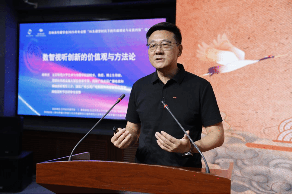 北京师范大学艺术与传媒学院副院长杨乘虎以《数智视听创新的价值观与方法论》为题进行主旨演讲。杨乘虎教授以上海高校专业作品《AR爸爸》为例,深入剖析AIGC技术应用中引发的真实性与伦理问题,强调需要重新审视智能时代真实与虚构的艺术边界,重点关注专业化应用中的版权确认、创作权属等法律和伦理规范。他强调,虽然技术实现了“平权”,但人的审美判断、文化理解与艺术转化能力仍是不可替代的核心资源,呼吁推进技术与艺术、规范与创新的深度融合,构建符合中国审美与文化特征的视听创作新体系。