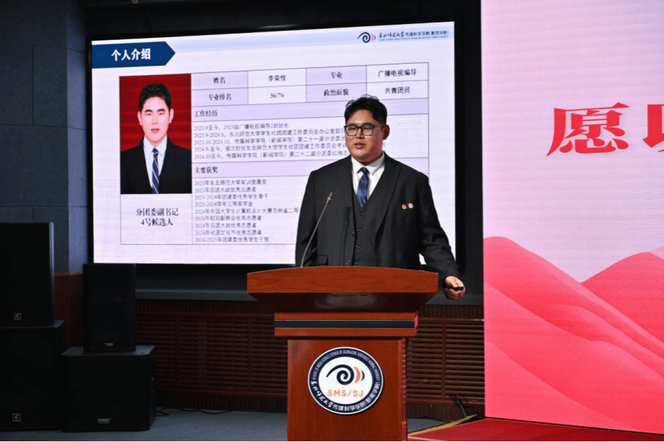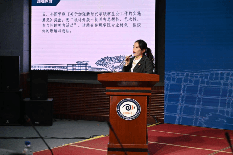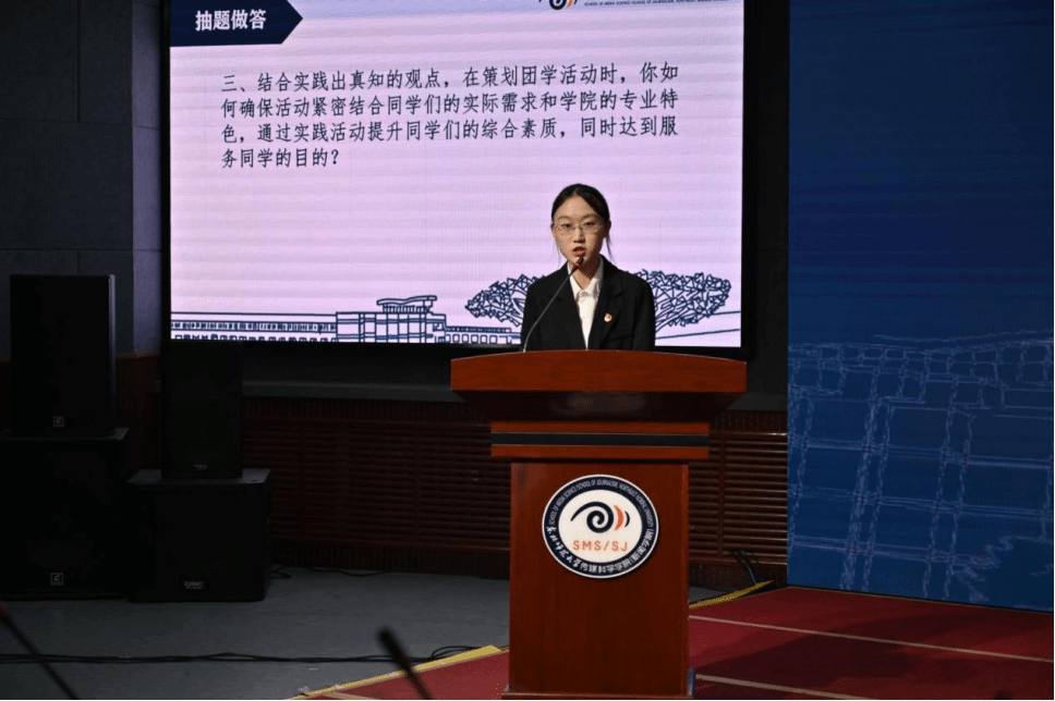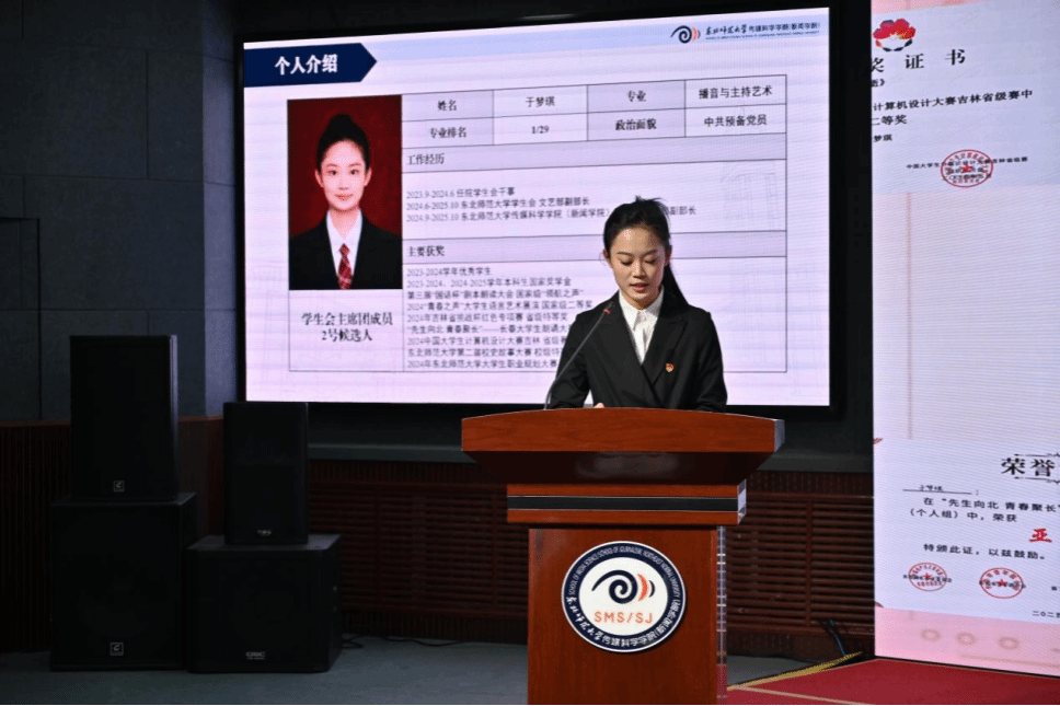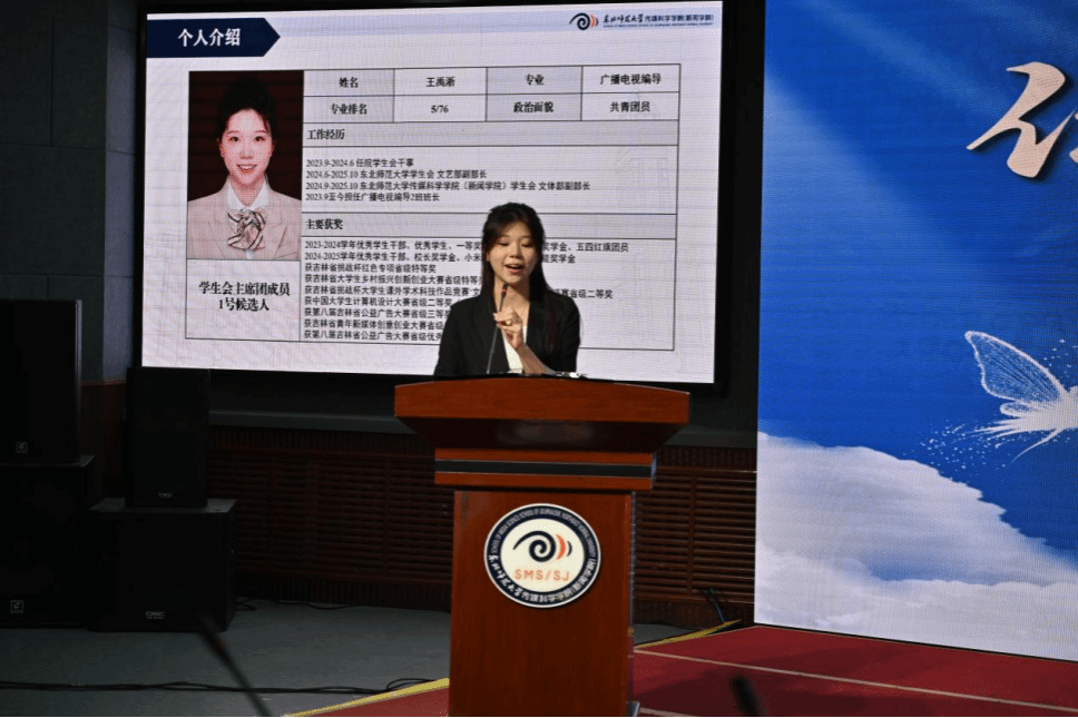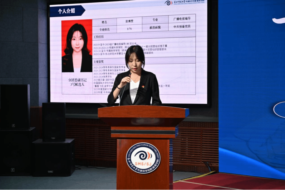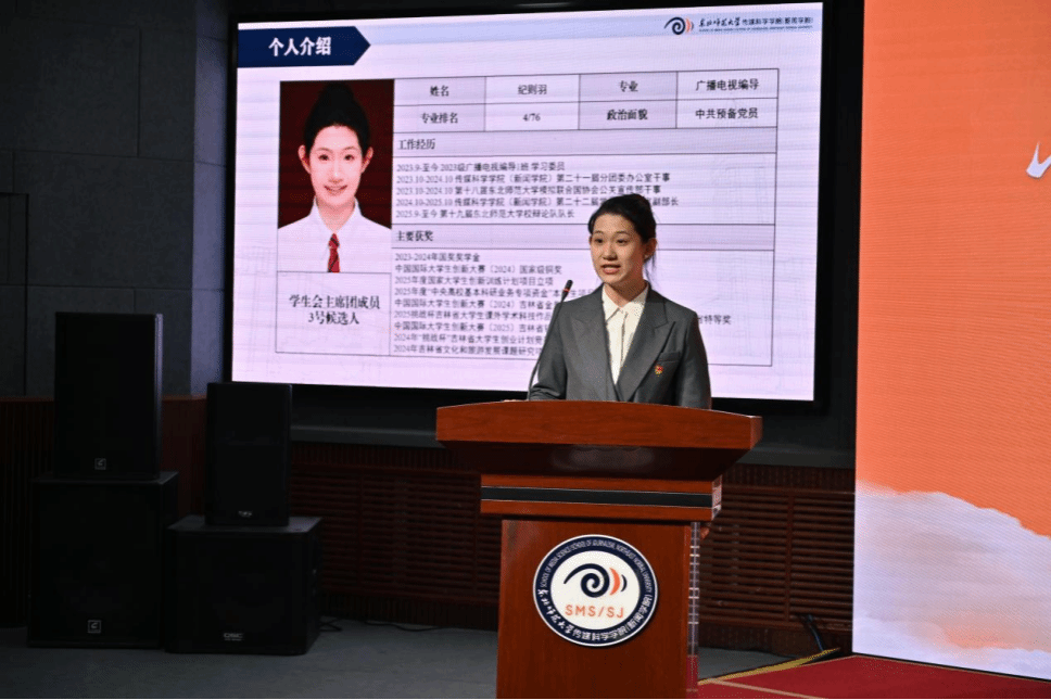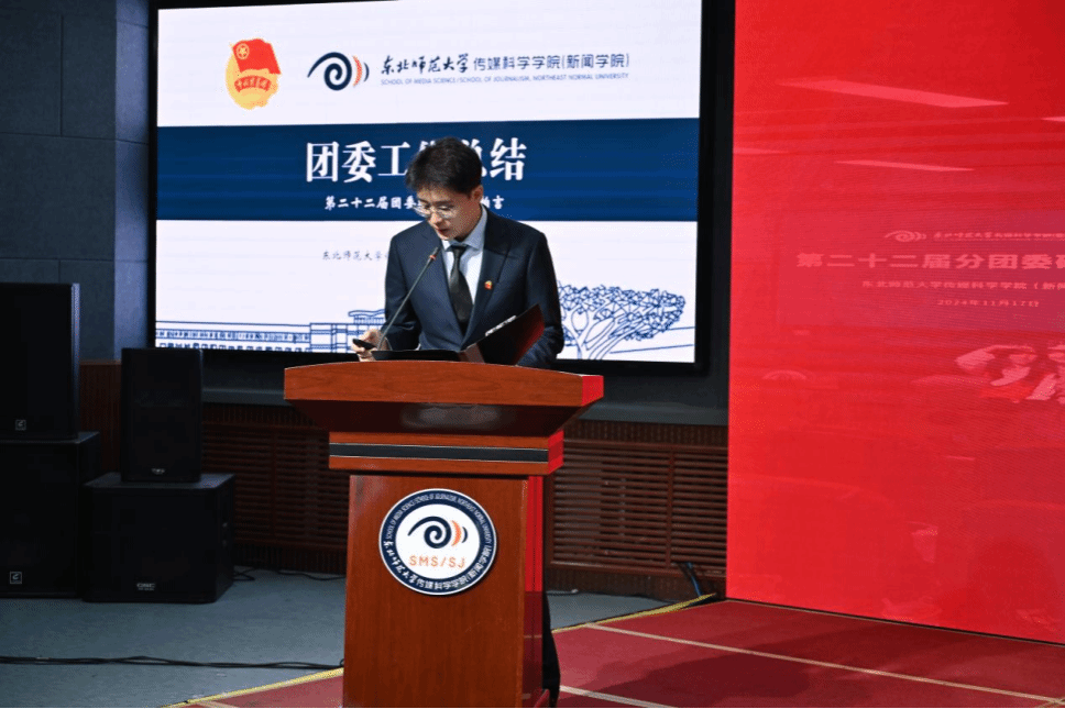 竞选结束后,第二十二届分团委副书记陈柏言、学生会主席团成员金子琪,分别代表上一届分团委与学生会作工作报告。报告系统回顾了过去一年团学组织的工作,明确阐述了工作遵循的指导思想与行动纲领,详细介绍了开展的各项具体举措与实施过程,全面总结了取得的建设性成果与实际成效。同时,二人还分享了工作中的思考,并对新一届团学组织工作提出建议,既为团学工作坚定了理想信念,也传递了对传媒学院团学事业的殷切期望与美好祝愿。