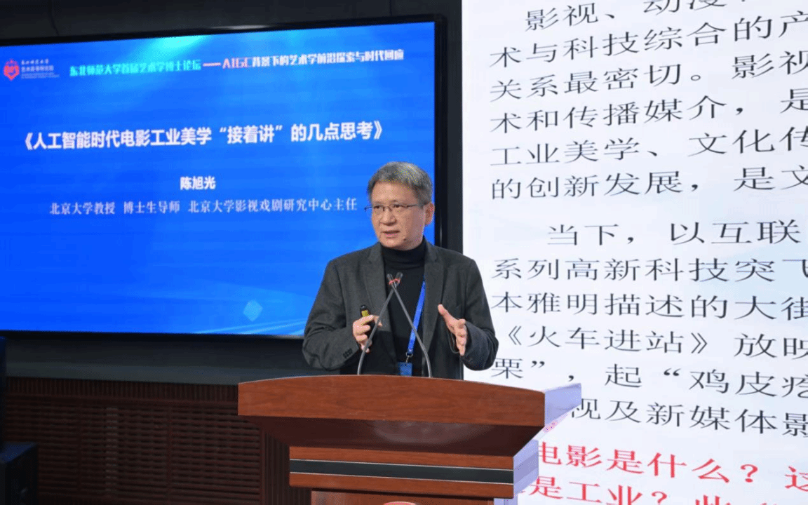 北京大学艺术学院教授、影视戏剧研究中心主任陈旭光带来《人工智能时代电影工业美学‘接着讲’的几点思考”》。他用“轻化”概括电影工业美学在人工智能时代“接着讲”的趋势,表示人工智能驱动的数智时代带来了媒介文化革命,给影视行业带来全方位、全产业链的变化,同时也给我们的思维、想象力、理论思考等带来巨大冲击,也带来更多弄潮、冲浪的机会。电影美学研究需聚焦三个关键命题:一是主体性即“人机一体”的问题;二是美学阐释的问题即虚拟现实与真实观的问题;三是伦理问题即艺术创作的道德危机和工作伦理。