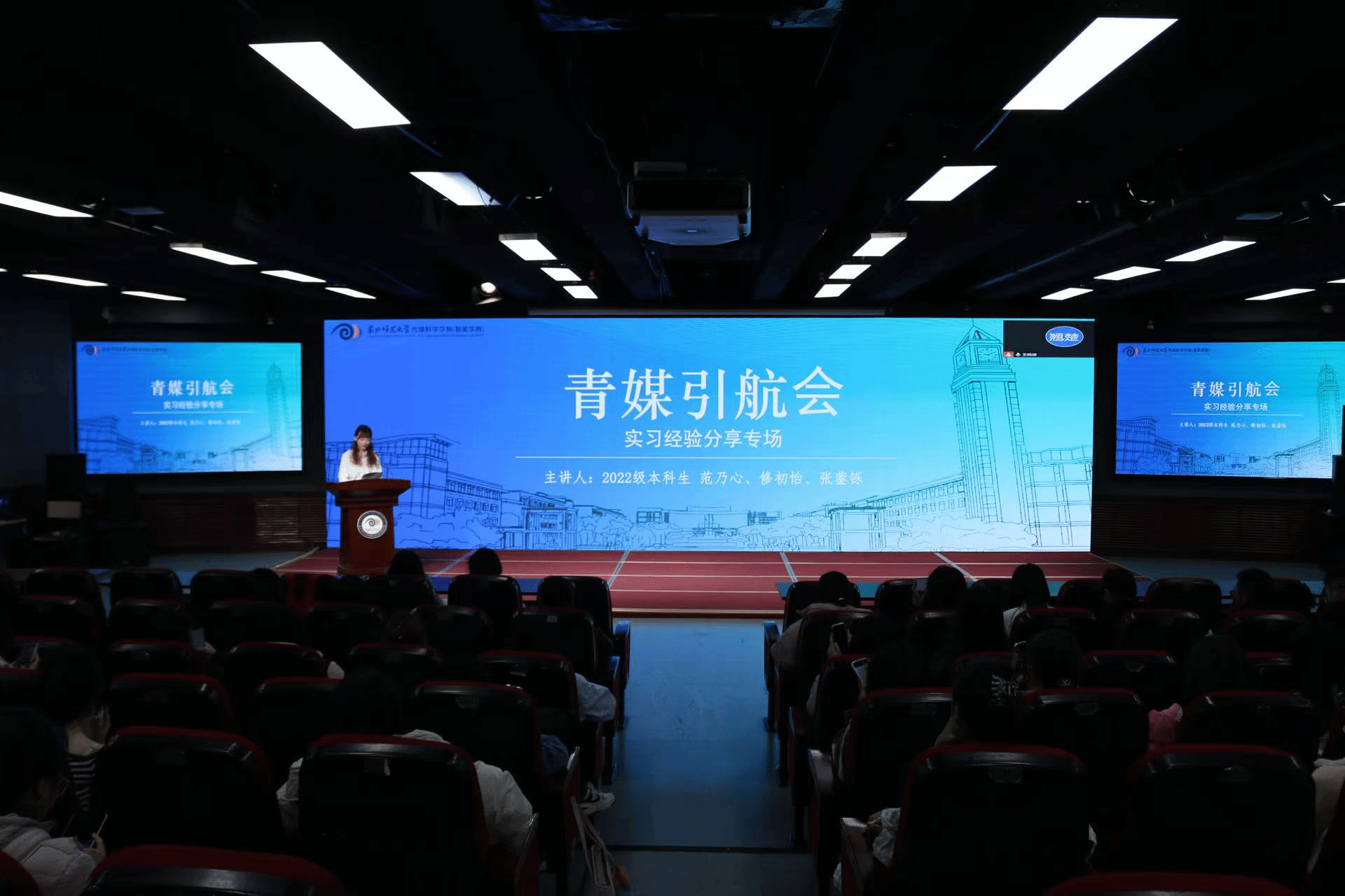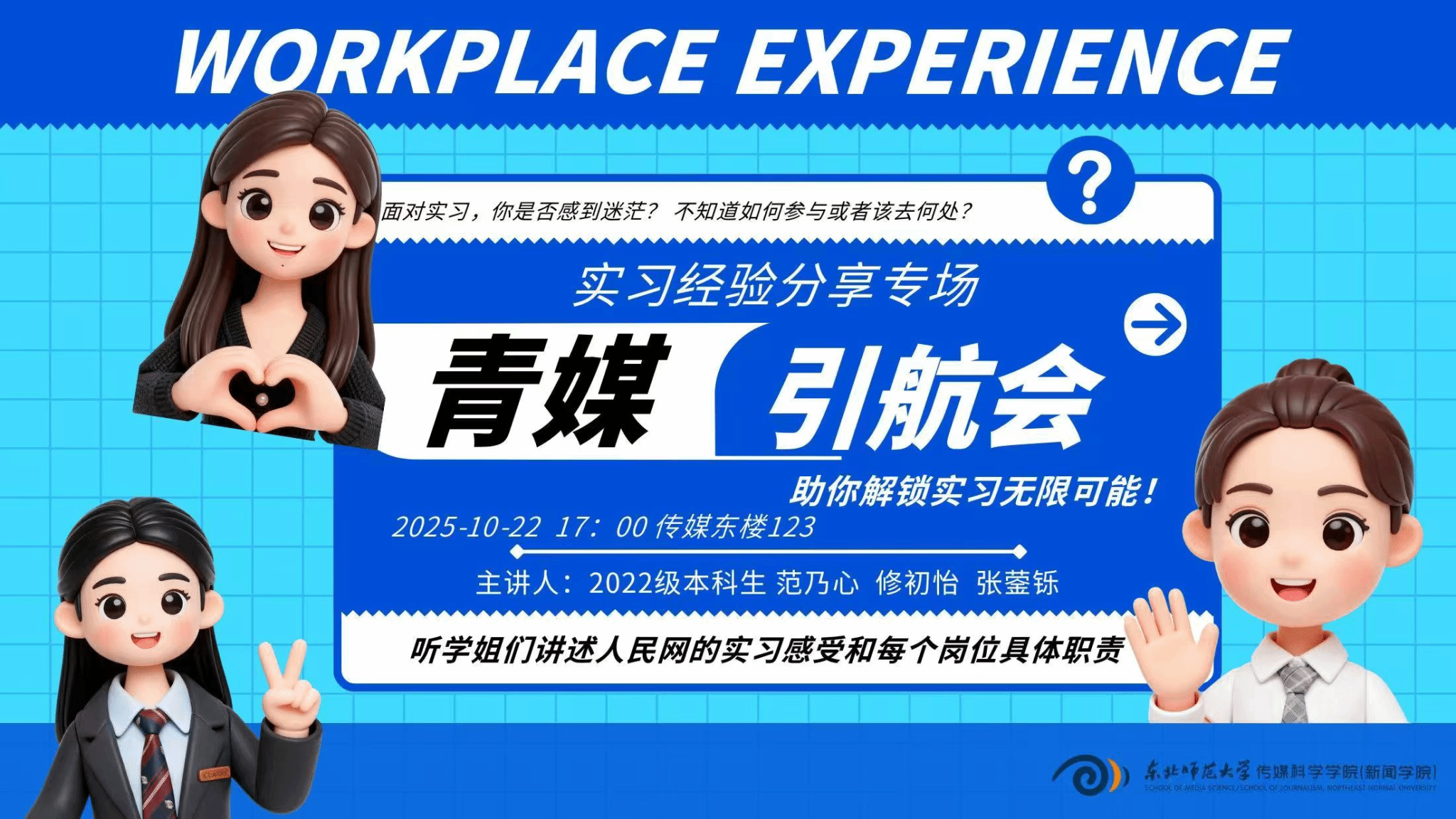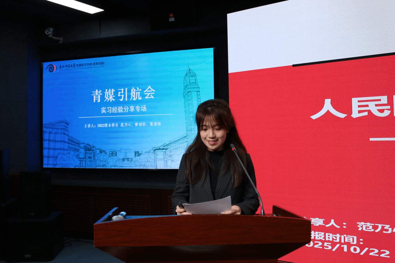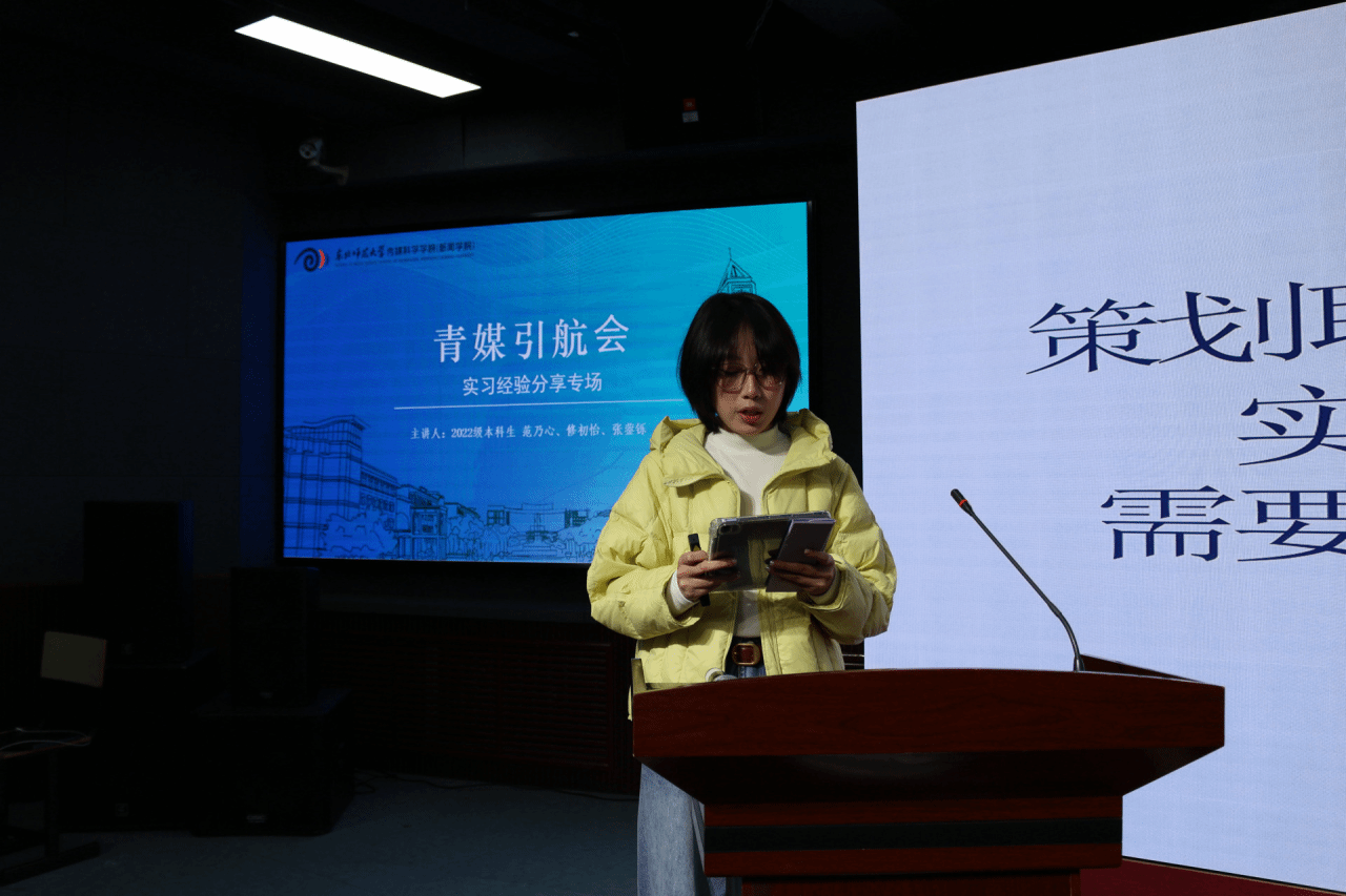 为解答同学们心中对专业实习的迷茫与困惑,搭建从校园通向职场的认知桥梁,传媒科学学院(新闻学院)于10月22日下午5:00在123多功能放映厅举办青媒引航会——实习经验专场分享会。会议特邀2022级本科生范乃心、张蓥铄、修初怡三位学姐,以其在头部媒体平台——人民网实习的亲身经历,为同学们带来一场关于传媒实习的深度解析与经验分享。