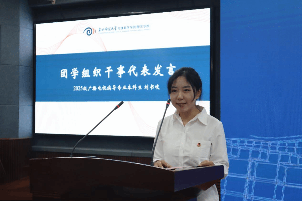 2025级广播电视编导专业本科生刘书岐同学作为团学组织干事代表发言,她表达了对加入团学组织的感激与憧憬,并表示在未来的工作中将以高标准要求自我,秉持“成就大我”的初心,以热忱之心服务同学,以严谨态度投入工作,在团学组织的广阔平台上锻炼成长、贡献力量,与全体新成员共同书写学院发展的青春篇章。