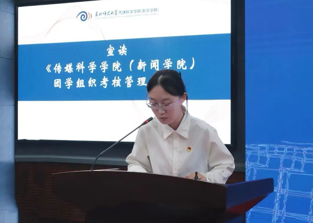 随后,分团委副书记宋伟同学对《传媒科学学院(新闻学院)团学组织考核管理办法》进行宣读,该办法旨在规范组织建设、提升服务效能,办法遵循定量与定性结合、过程与目标并重等原则。设置团学组织考核机制,标志着团学工作迈向制度化、规范化新阶段。