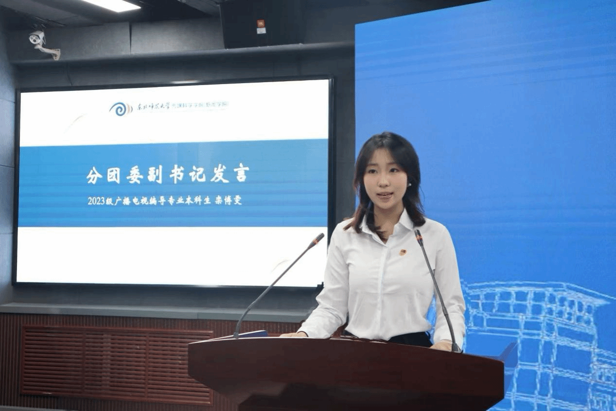 分团委副书记2023级广播电视编导专业本科生栾博雯同学进行发言。她围绕红、传媒、美三个维度,为我们成为新时代美的红色传媒人指明了努力方向和行为准则,鼓励团学组织成员们为学校进步和国家发展贡献青春力量。