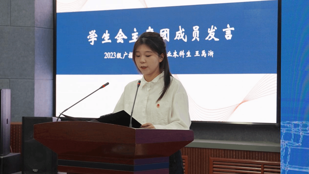 学生会主席团成员2023级广播电视编导专业本科生王禹淅同学在发言中指出,“团学工作不是一个人的旅途,而是一群人同行。”并强调,新一届学生会将立足同学需求,通过优化流程、强化部门协作以及注重细节落实,切实解决实际问题,以务实的行动提升服务质量,与成员共同成长。