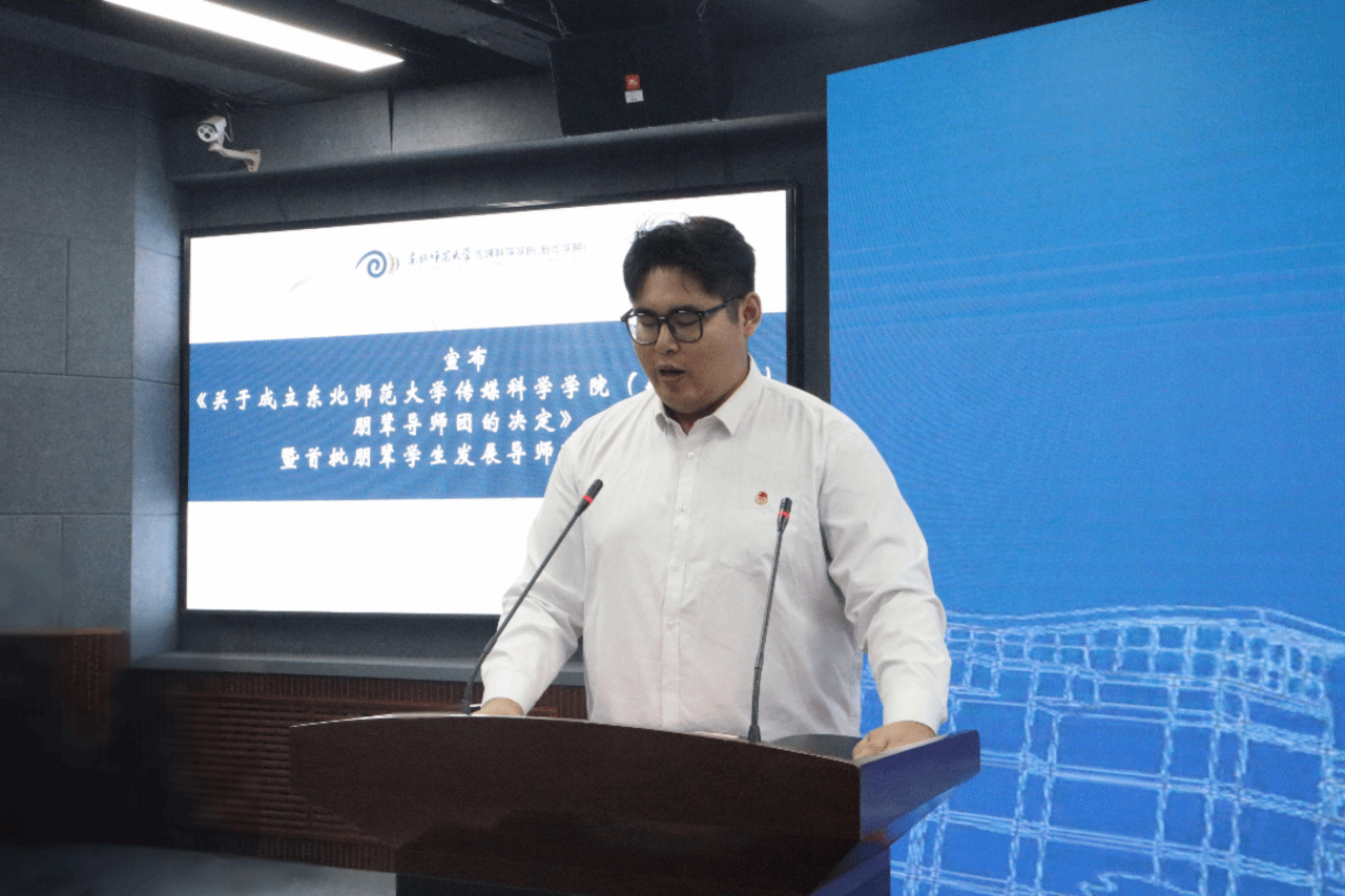 接着,分团委青马学会执行部长李荣悦同学宣读《关于成立东北师范大学传媒科学学院(新闻学院)朋辈导师团的决定》暨首批朋辈学生发展导师聘任仪式。经严格选拔,学院聘任陈柏言、金子琪、赵昱植、高嘉忆、白禾、李思垚和张嘉欣同学担任朋辈导师。朋辈导师团由优秀学生、校友和行业专家组成,旨在通过学业、生涯、生活等方面的帮扶,助力学生成长,落实立德树人根本任务,践行“传艺送道,媒文成章”的根本理念。