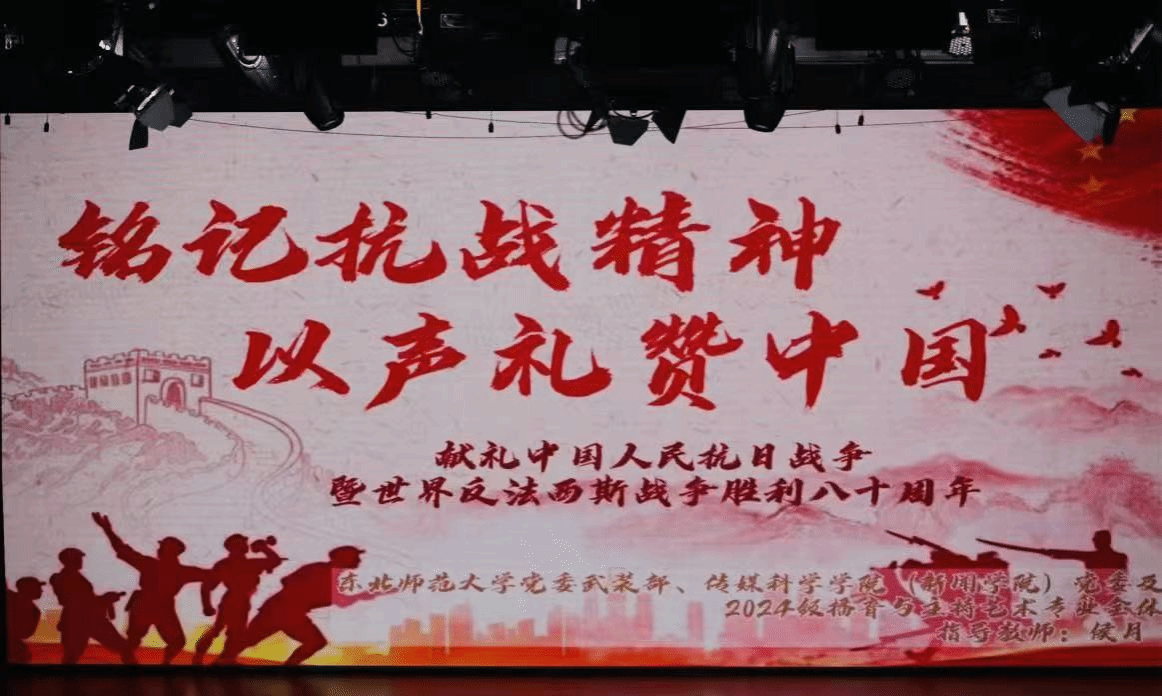 为深刻铭记中国人民抗日战争暨世界反法西斯战争胜利的伟大征程,进一步提升播音与主持艺术专业学生的舞台表现力与综合素养,2025年11月3日13:30,东北师范大学党委武装部、传媒科学学院(新闻学院)党委及团委联合献礼中国人民抗日战争暨世界反法西斯战争胜利八十周年暨2024级播音与主持艺术班期中汇报演出在我院313小剧场隆重召开。
