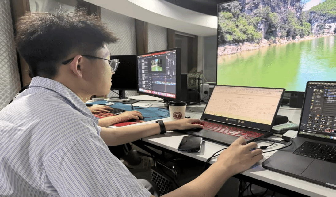 学术与艺术的交融:师生团队将传媒学科“新时代美的红色传媒人”培养目标融入创作,通过田野调查、文献考证与影像叙事相结合,挖掘珠江流域“山-水-商-文”的共生关系。技术赋能文化表达:我院戏剧影视专业博士潘勃良运用航拍、动态摄影等前沿技术,突破传统纪录片线性叙事,以多维度影像语言呈现珠江流域生态与人文的多元互动。青年视角的在地性挖掘:我院广播电视专业硕士张荣宝在后期制作中,通过剪辑节奏与声音设计强化“烟火气”,让珠江文化从宏大叙事落地为普通人可感可知的生活图景。