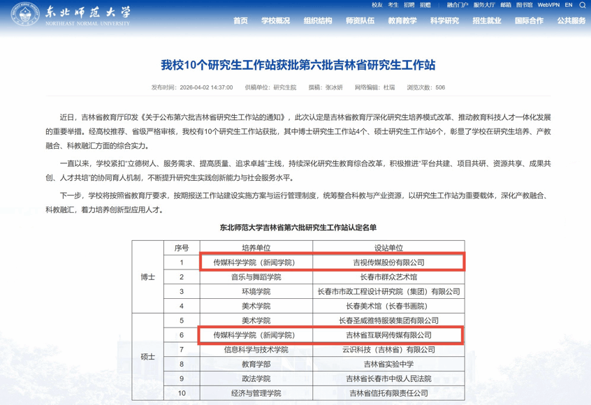 近日,吉林省教育厅公布第六批吉林省研究生工作站认定名单,东北师范大学10个研究生工作站成功获批,其中硕士研究生工作站6个,博士生研究生工作站4个。其中我院在吉视传媒股份有限公司设立的博士研究生工作站、吉林省互联网传媒有限公司设立的硕士研究生工作站成功入选本次认定名单。此次入选历经高校申报推荐、省级严格评审等多环节筛选,充分体现了我院长期积累的科研实力与成熟的校企合作育人水平。我院将以此为新的发展契机,持续深化科教融合与产教协同,进一步完善硕博研究生培养模式与育人机制,着力培育“美的传媒人”“新时代红色传媒人”,不断提升专业人才培养质量与学科综合实力。